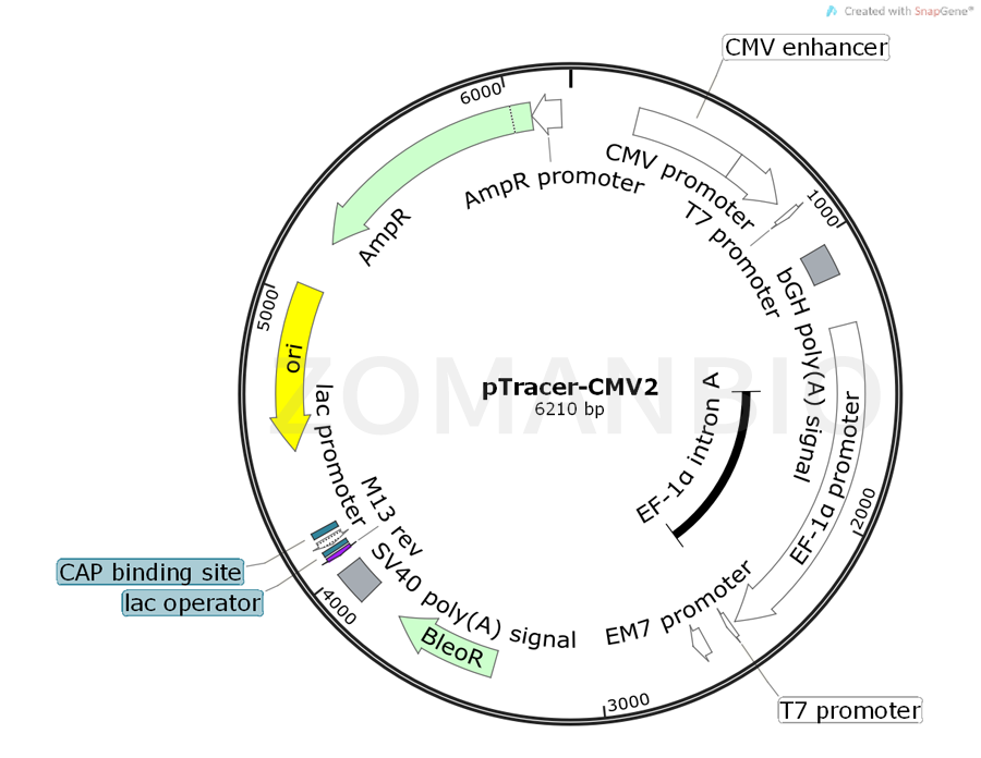 pTracer-CMV2 is a 6.2 kb mammalian expression vector derived from pcDNA3.1 and designed for visual detection of transformed E. coli cells and transfected mammalian cells. The vector contains the following elements: