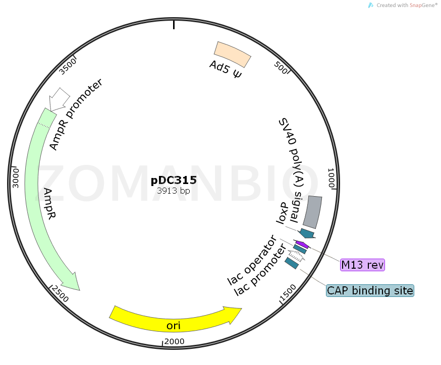 pDC315質(zhì)粒是一種真核表達(dá)質(zhì)粒載體,將目的基因插入多克隆位點(diǎn),轉(zhuǎn)染細(xì)胞即可進(jìn)行表達(dá)。 帶有目的基因的 pDC315 可以通過(guò)插入位點(diǎn)兩側(cè)的酶切位點(diǎn)以及目的基因內(nèi)部的特異酶切位點(diǎn)進(jìn)行鑒定。