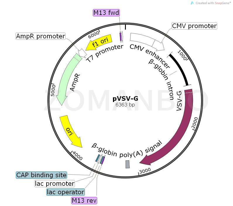 pVSV-G表示G蛋白的水泡性口炎病毒(VSV-G)的控制下CMV立即早期啟動子。VSV-G用于假Moloney Murine Leukenia病毒(MMLV)-介導(dǎo)病毒進入通過逆轉(zhuǎn)錄病毒載體VSV-G與磷脂。靶細胞膜的組成部分,并促進病毒和細胞膜的融合。利用不需要的細胞表面受體,可以作為一個替代病毒包膜蛋白。pVSV-G向量包括靜脈輸液,以提高合成的內(nèi)含子的mRNA的穩(wěn)定性,復(fù)制和氨芐青霉素抵抗細菌的Col E1起源(Ampr)基因的傳播和細菌中抗生素的選擇。