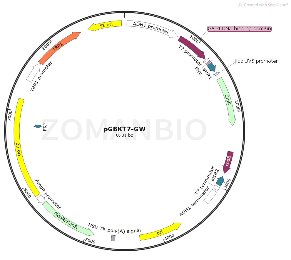 pGBKT7-GW質粒是一個用GateWay方法做克隆的酵母雙雜交質粒。