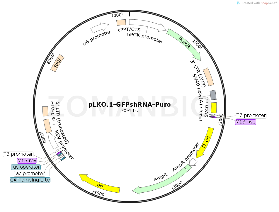 pLKO.1-GFPshRNA質(zhì)粒是在pLKO.1-Puro載體上克隆了一段GFPshRNA序列得到的一個哺乳細胞慢病毒RNA干擾質(zhì)粒。U6啟動GFPshRNA的轉(zhuǎn)錄,可特異性的干擾GFP蛋白的表達。該質(zhì)??勺鳛槠胀ㄟ^表達質(zhì)粒直接轉(zhuǎn)染哺乳細胞,也可包裝成慢病毒侵染細胞。質(zhì)粒本身帶有Puro篩選標記,可用嘌呤霉素篩選轉(zhuǎn)染后的細胞得到陽性克隆。