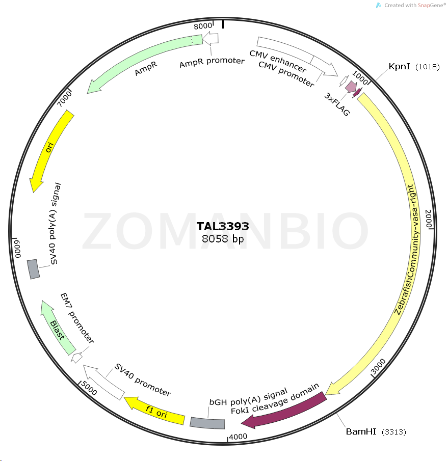 TAL3393質(zhì)粒是一個表達斑馬魚基因的真核表達質(zhì)粒,CMV promoter啟動ZebrafishCommunity-vasa-right基因的表達。