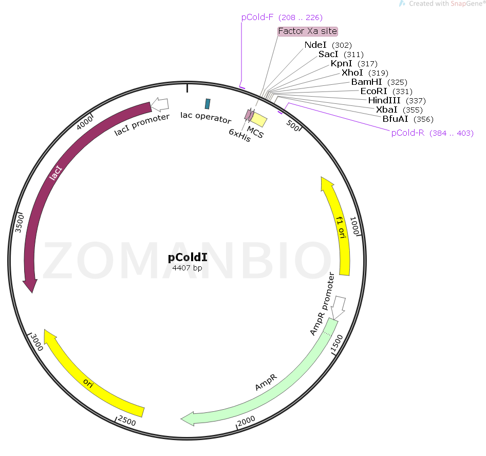 pColdI質(zhì)粒是利用冷休克基因CSPA啟動子設(shè)計高效率蛋白質(zhì)表達載體。在啟動子下游處,插入了lac操縱子,以便嚴格控制表達。此外,5’非翻譯區(qū)(5’UTR),翻譯增強元件(TEE),His標(biāo)簽序列,Xa因子切割位點和多克隆位點(MCS)位于CAPS啟動子的下游。當(dāng)培養(yǎng)溫度切換到低溫時,大腸桿菌暫時停止生長,大部分的大腸桿菌蛋白質(zhì)表達減少,但是一類稱為冷休克蛋白的蛋白質(zhì)被特異性誘導(dǎo)表達。