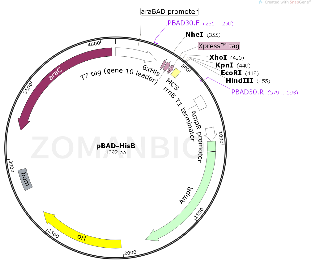 pBAD-HisB質(zhì)粒是衍生于pBR322載體。載體設(shè)計(jì)用來在大腸桿菌中進(jìn)行可調(diào)節(jié),劑量依賴性的表達(dá)和純化重組目的蛋白。使大腸桿菌araBAD啟動(dòng)子(pBAD)增強(qiáng)了大腸桿菌重組蛋白可溶性表達(dá)的水平。pBAD/His和pBAD/Myc His載體上的調(diào)節(jié)蛋白AraC能夠調(diào)控pBad啟動(dòng)子。pBAD/Myc-His B 載體是阿拉伯糖調(diào)控載體,在無葡萄糖的培養(yǎng)基中,阿拉伯糖正向調(diào)控目的基因的表達(dá),通過調(diào)節(jié)阿拉伯糖的濃度水平來優(yōu)化目的蛋白的可溶性表達(dá)。