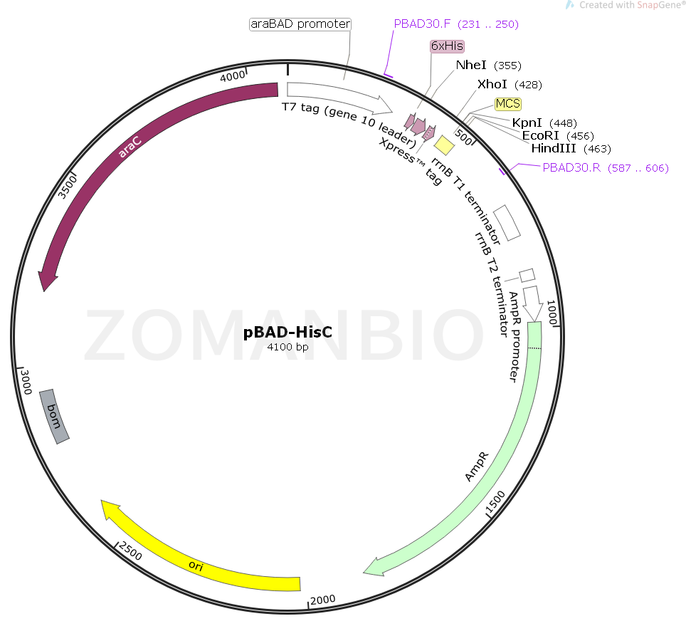 pBAD/His和PBAD/Myc-His載體質(zhì)粒是衍生于pBR322載體。載體設(shè)計用來在大腸桿菌中進(jìn)行可調(diào)節(jié),劑量依賴性的表達(dá)和純化重組目的蛋白。使用大腸桿菌araBAD啟動子(pBAD)增強(qiáng)了大腸桿菌重組蛋白可溶性表達(dá)的水平。pBAD/His和pBAD/Myc His載體上的調(diào)節(jié)蛋白AraC能夠調(diào)控pBad啟動子。pBAD/Myc-His A 載體是阿拉伯糖調(diào)控載體;在無葡萄糖的培養(yǎng)基中,阿拉伯糖正向調(diào)控目的基因的表達(dá);通過調(diào)節(jié)阿拉伯糖的濃度水平來優(yōu)化目的蛋白的可溶性表達(dá)。