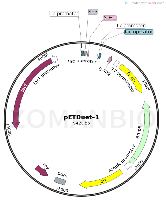 pETDuet-1載體被設(shè)計(jì)用來在大腸桿菌中同時(shí)表達(dá)兩個(gè)外源基因. 載體含有兩個(gè)多克隆位點(diǎn),每一個(gè)多克隆位點(diǎn)是通過T7啟動(dòng)子/Lac操縱子和一個(gè)核糖體結(jié)合位點(diǎn)組成。pETDuet-1攜帶有pBR322質(zhì)粒來源的ColE1復(fù)制子, lacI基因和氨芐抗性基因。本載體可以與pACYCDuet-1載體聯(lián)合使用,在合適的宿主菌中,可以一起共表達(dá)至多4個(gè)目的基因。插入在pETDuet-1載體多克隆位點(diǎn)1的目的基因可以使用pET Upstream 引物和DuetDOWN1 引物進(jìn)行測(cè)序,插入在多克隆位點(diǎn)2的目的基因可以通過DuetUP2 引物 和T7 Terminator 引物進(jìn)行目的基因測(cè)序。