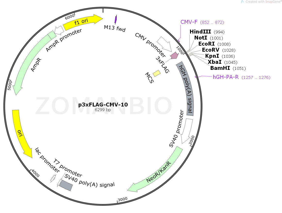 p3×FLAG-CMV-10表達(dá)載體是用于在哺乳動物細(xì)胞中建立N-3×FLAG融合蛋白的瞬時(shí)或穩(wěn)定細(xì)胞內(nèi)的pCMV5表達(dá)載體的升級版。該載體在多克隆區(qū)域上游編碼三個(gè)相鄰的FLAG表位(Asp-Tyr-Lys-Xaa-Xaa-Asp)。這導(dǎo)致使用FLAG抗體的檢測靈敏度增加。第三個(gè)FLAG表位包括腸激酶識別序列,允許從純化的融合蛋白切割3×FLAG肽。